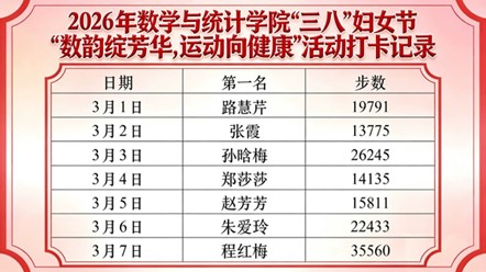 为庆祝第116个“三八”国际劳动妇女节,倡导健康文明生活方式,丰富女教职工精神文化生活,3月1日至3月7日,数学与统计学院精心组织开展“数韵绽芳华,运动向健康”主题活动,以轻松有趣的运动打卡形式,向全院女教职工送上诚挚的节日问候与美好祝福。