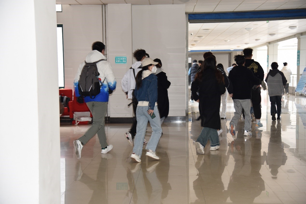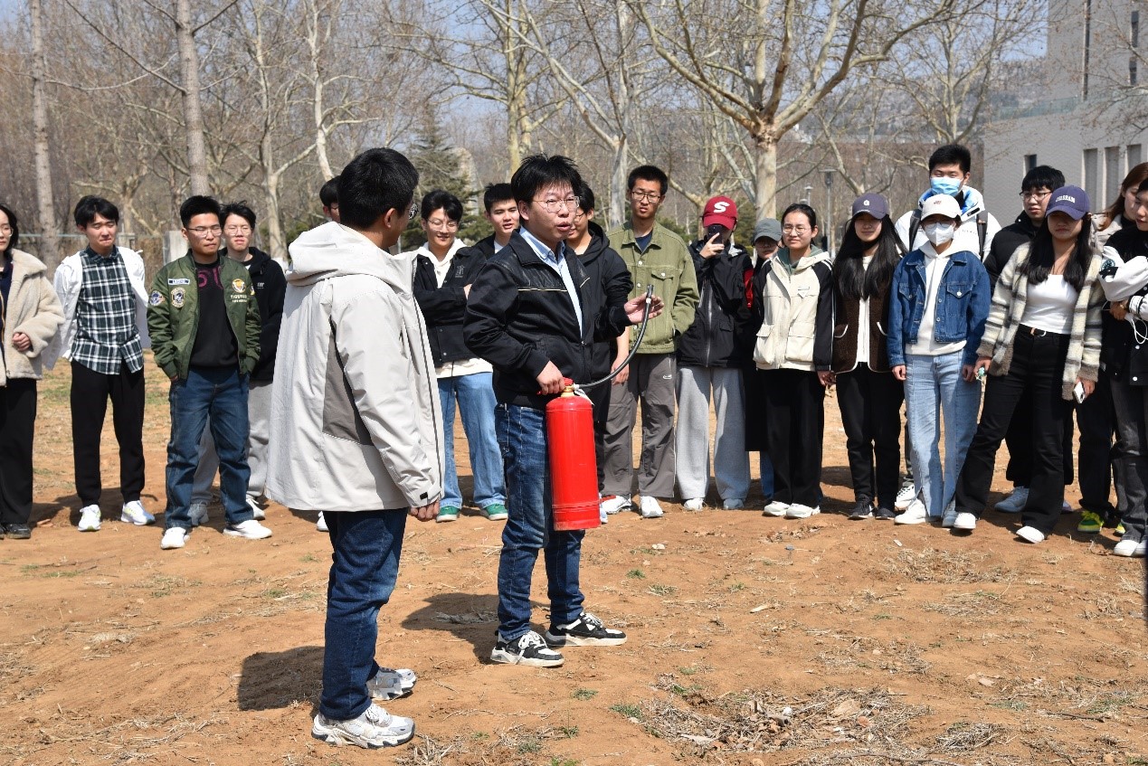 讲解结束后,同学们模拟了火场逃生和紧急疏散,大家有序离开教室,迅速下楼到达教学楼外的指定集合地点,在清点人数无误后,志愿者将大家带到文渊楼A区西侧空地练习使用灭火器。