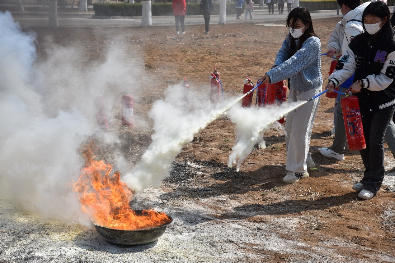 董洪涛详细讲解了灭火器的构造和用法,我院部分教师与同学们一起虚心学习并分组进行了实际操作练习,在志愿者的组织和协助下,大家迅速提起灭火器对准燃烧盆中的火焰喷去,雪白的干粉覆盖在鲜红的火焰上,现场冒出一阵阵白烟,同学们紧张而又激动地完成了灭火任务,内心充满自豪。