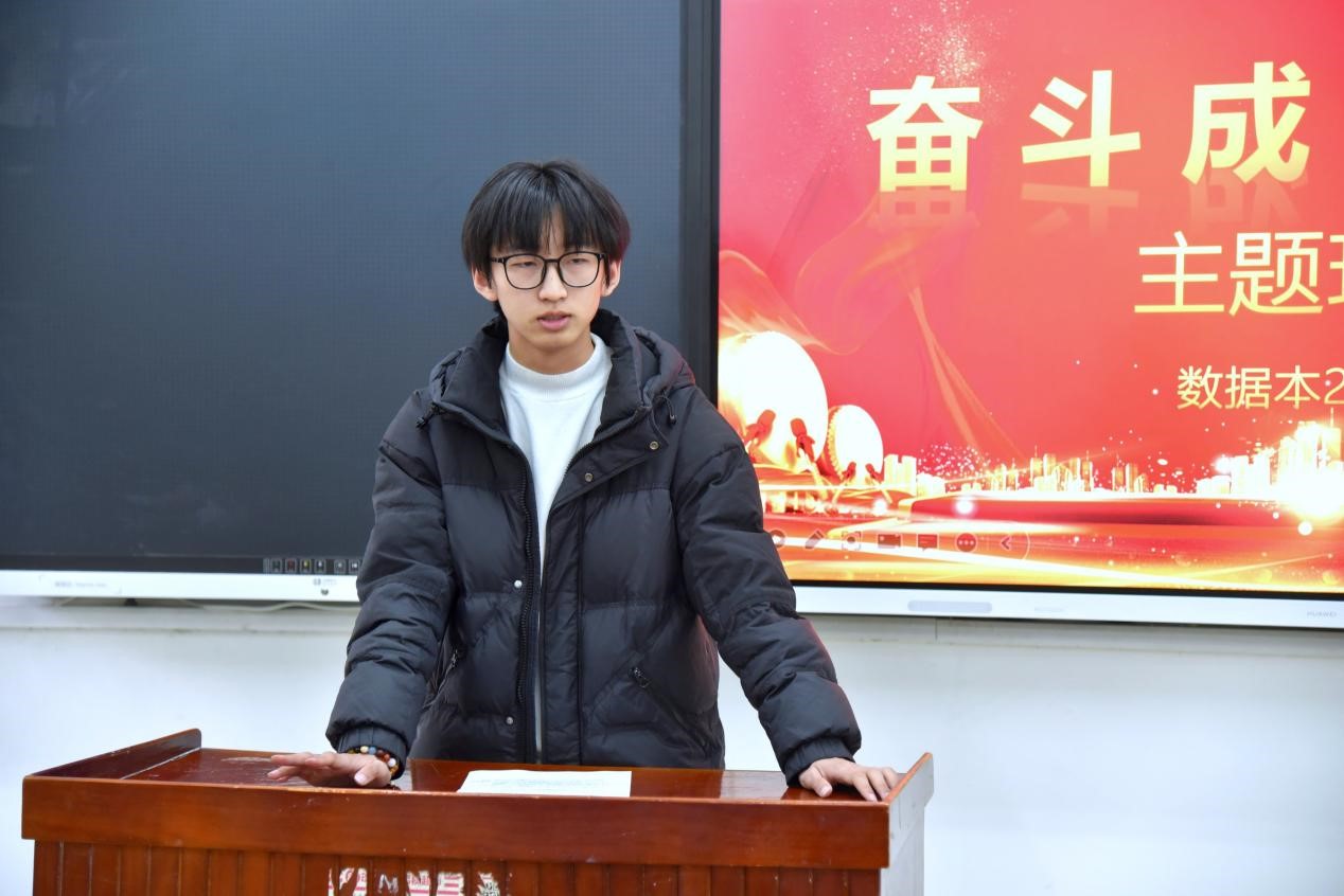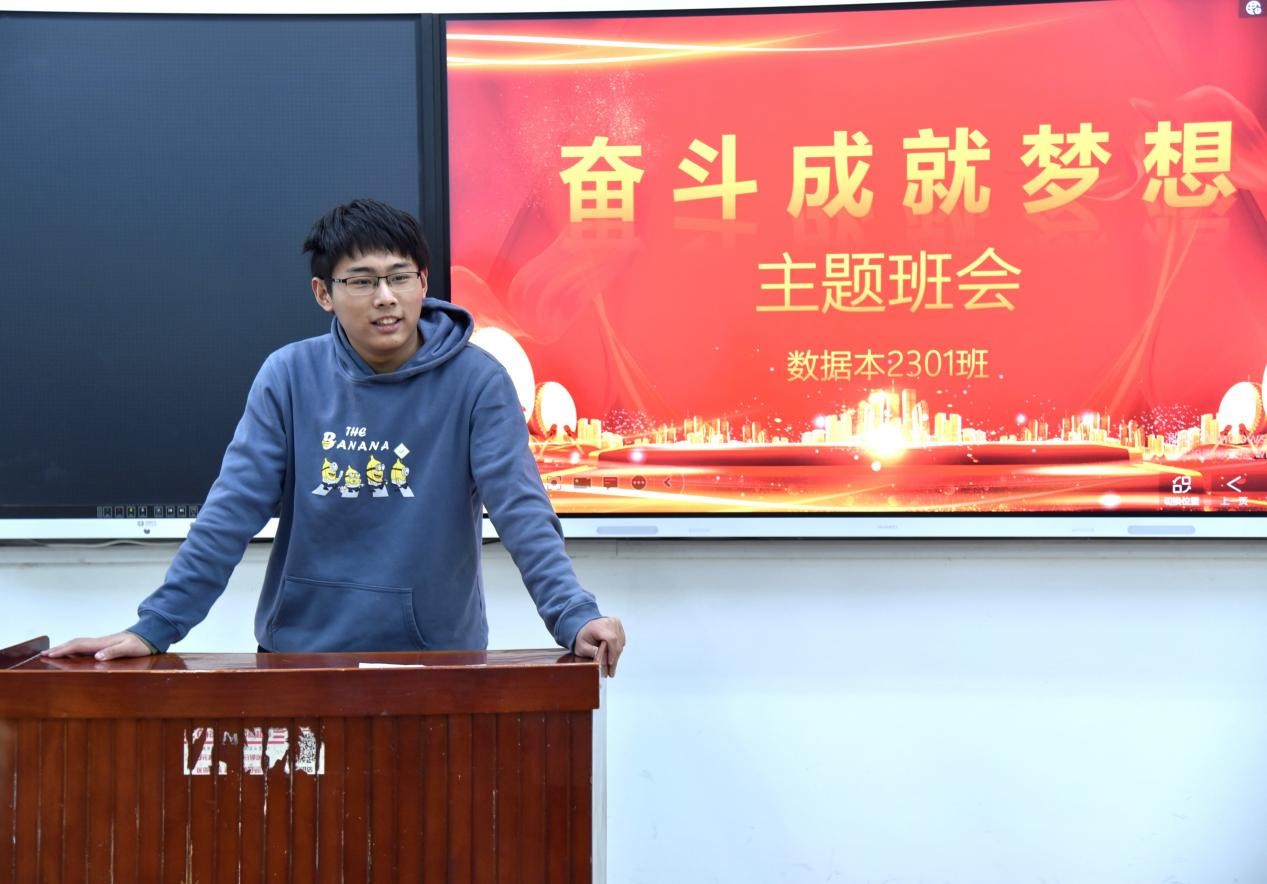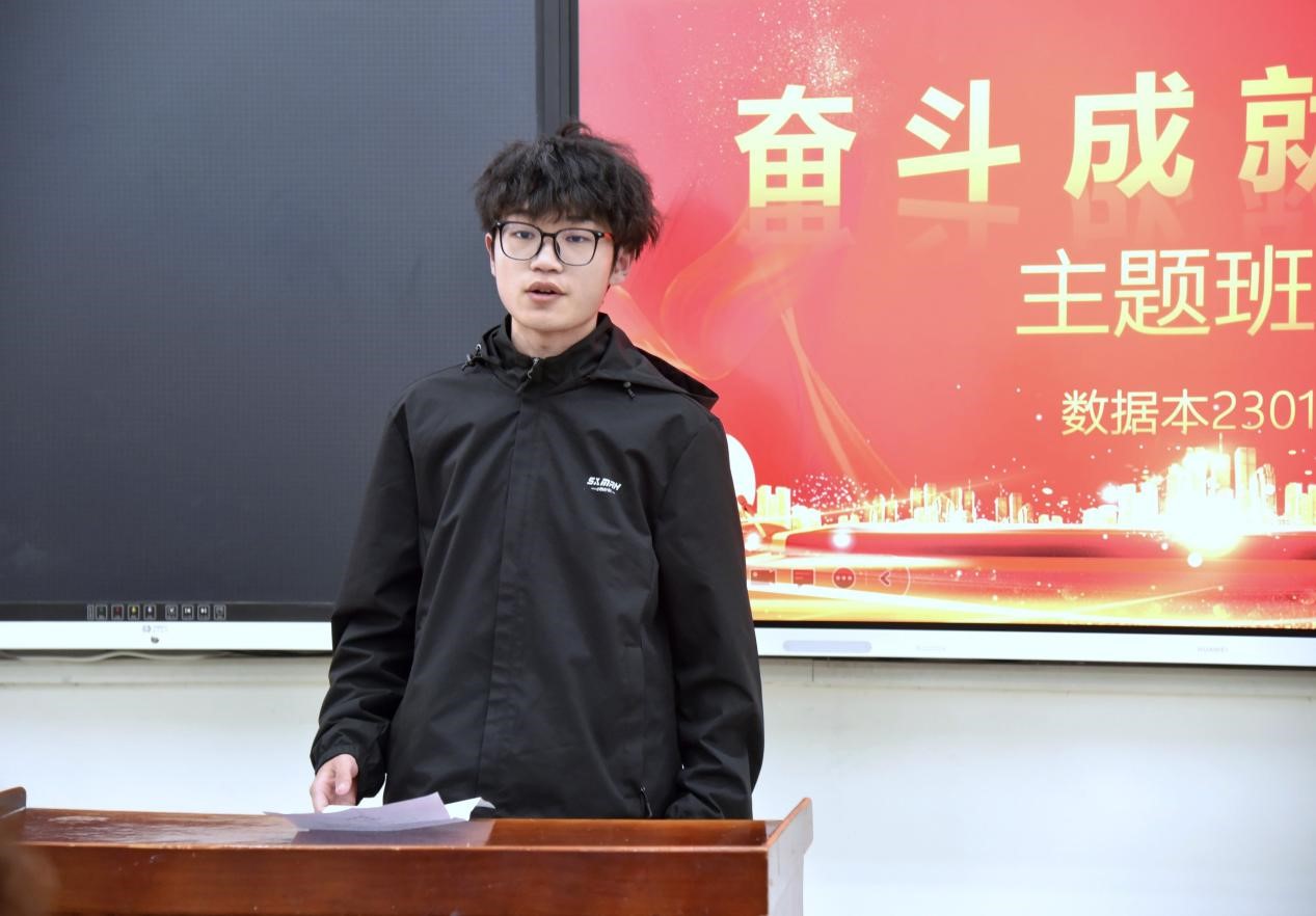 本次主题班会由数据本2301班杜松凤、朱洪涛主持。数据本2301班班长姚开远以“现在的学习决定未来”为题,分享了自己对于这个主题的理解。他认为,要基于未来的规划来决定现在要侧重于哪一方面的学习。同时,他向同学们简单介绍了一些适合于本专业参加的竞赛,从而提高自己的知识水平以及实践能力。最后呼吁大家,让未来作为指引我们前行的明灯,投入到现在的学习中去。