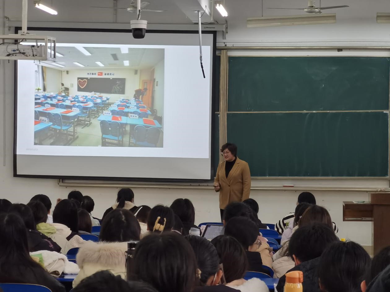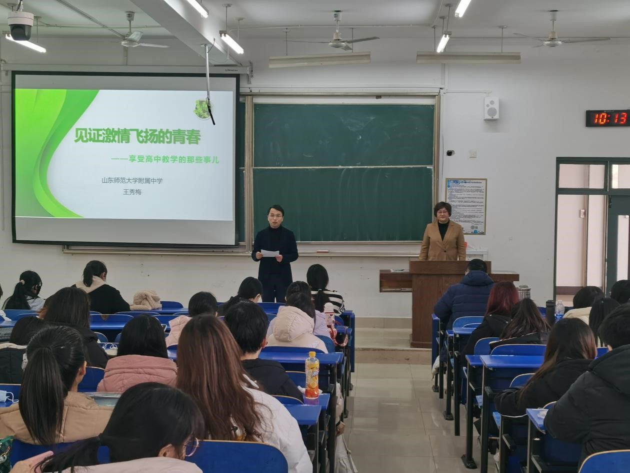 为进一步提升师范生专业技能水平,夯实专业基本功,12月12日上午,学院举办师范生教学技能专题培训讲座。我院特邀优秀校友、山东师范大学附属中学王秀梅老师为讲座主讲。讲座由院党委副书记葛海滨主持,学院2021级全体师范生参加。