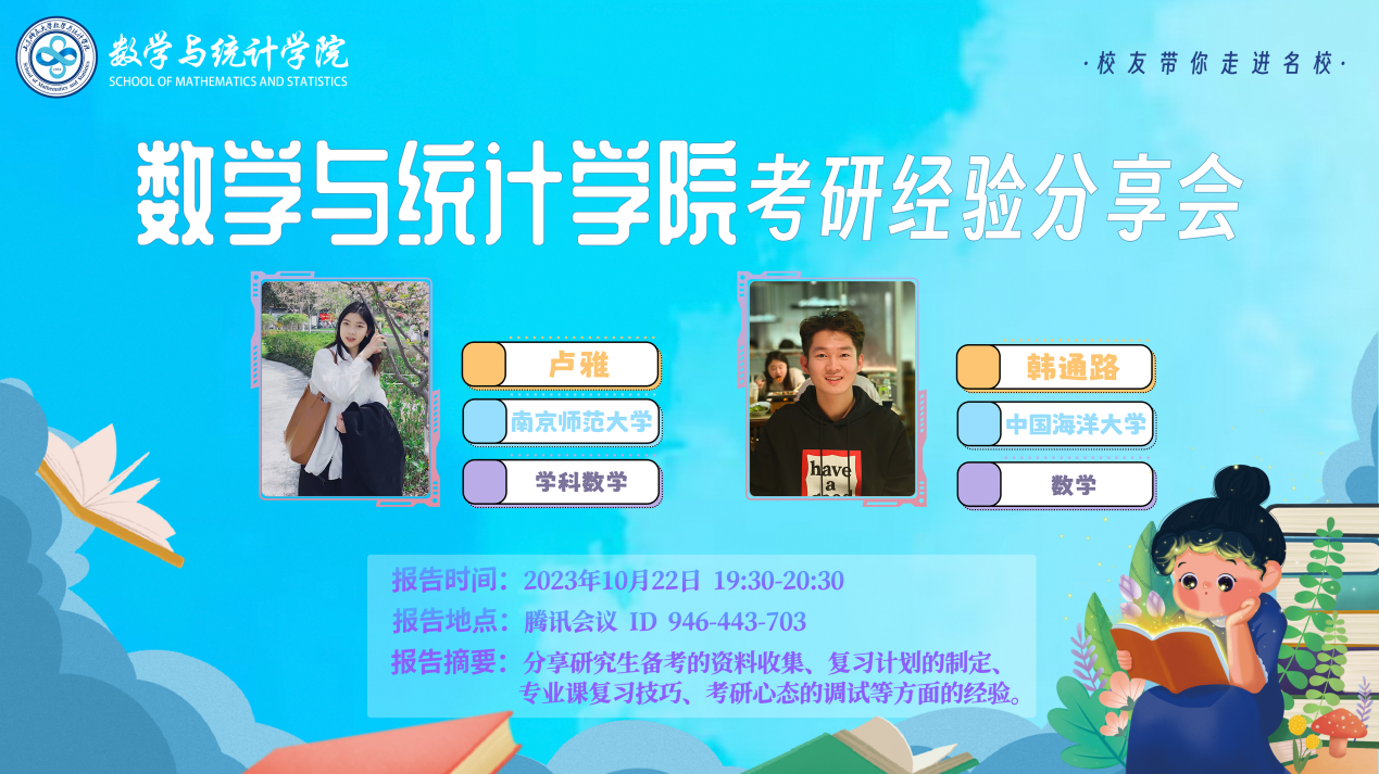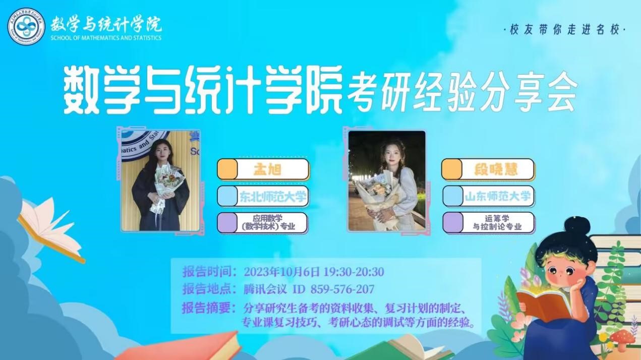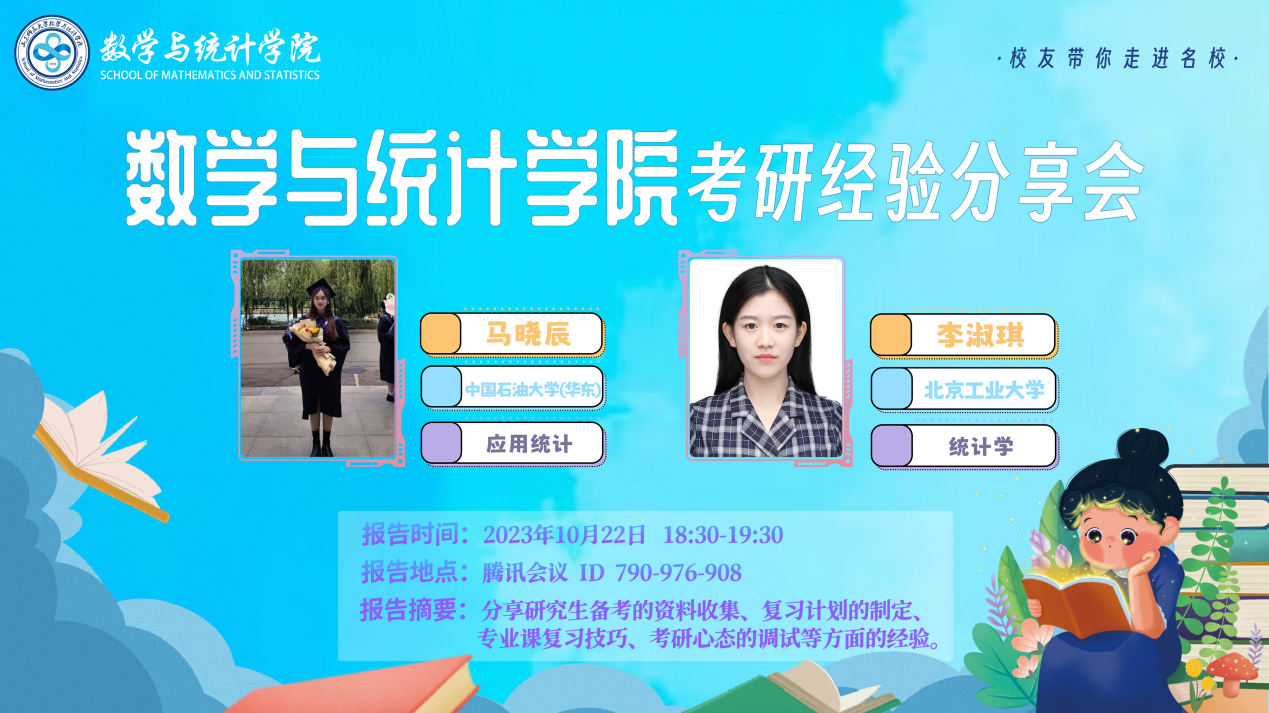 近期,数学与统计学院成功举办系列考研经验分享会,先后邀请了2022届优秀毕业生孟旭,2023届优秀毕业生段晓慧、马晓辰、李淑琪、卢雅、韩通路作为主讲人,学院2020级、2021级学生广泛参加。