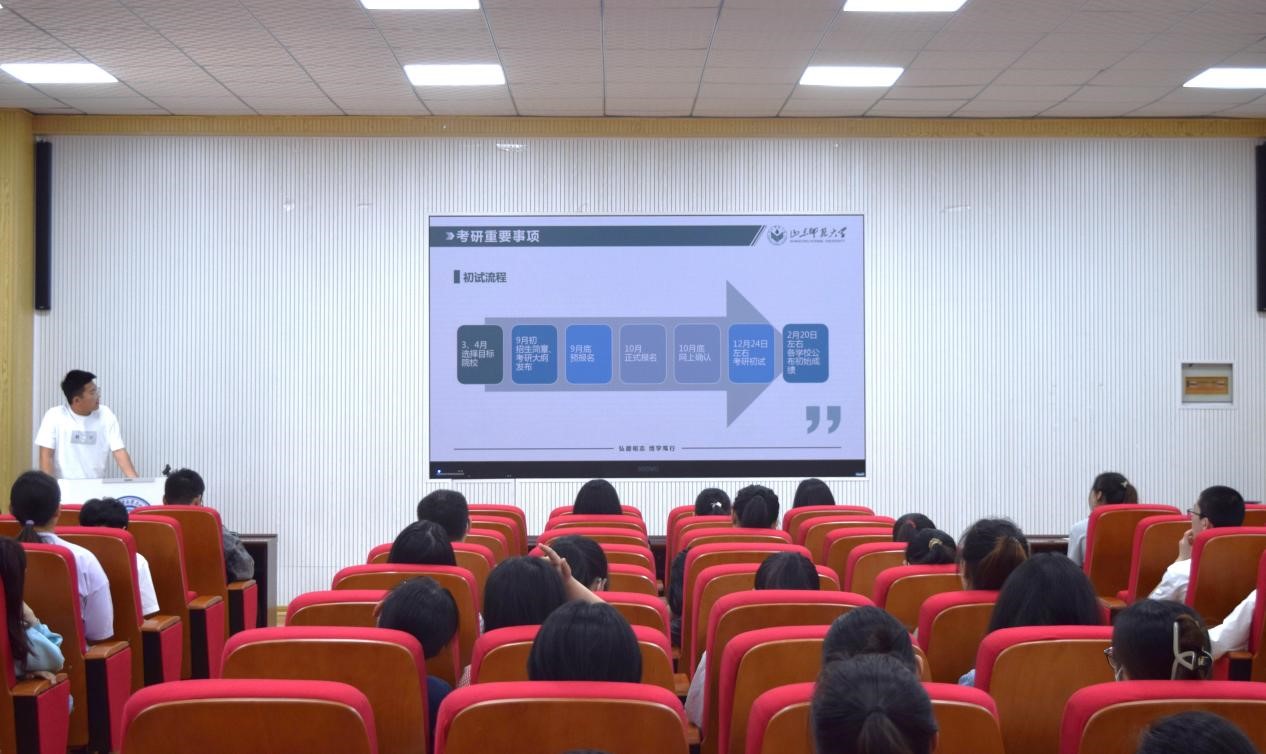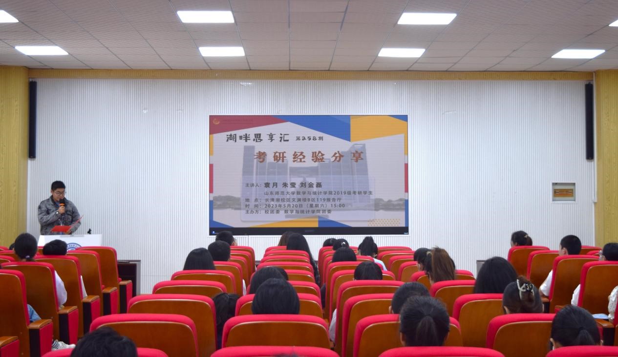 5月20日下午,数学与统计学院于长清湖校区文渊楼B区119报告厅举办湖畔思享汇系列活动第二百五十八场——“直挂云帆与考研之海奋力航行”考研经验分享会。本次讲座由校团委、数学与统计学院团委联合举办,邀请数学与统计学院2019级考研上岸学生袁月、朱莹、刘金磊为同学们分享考研经验,90余名同学到场聆听。