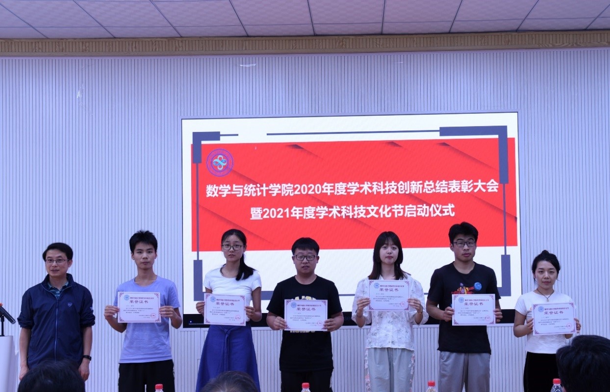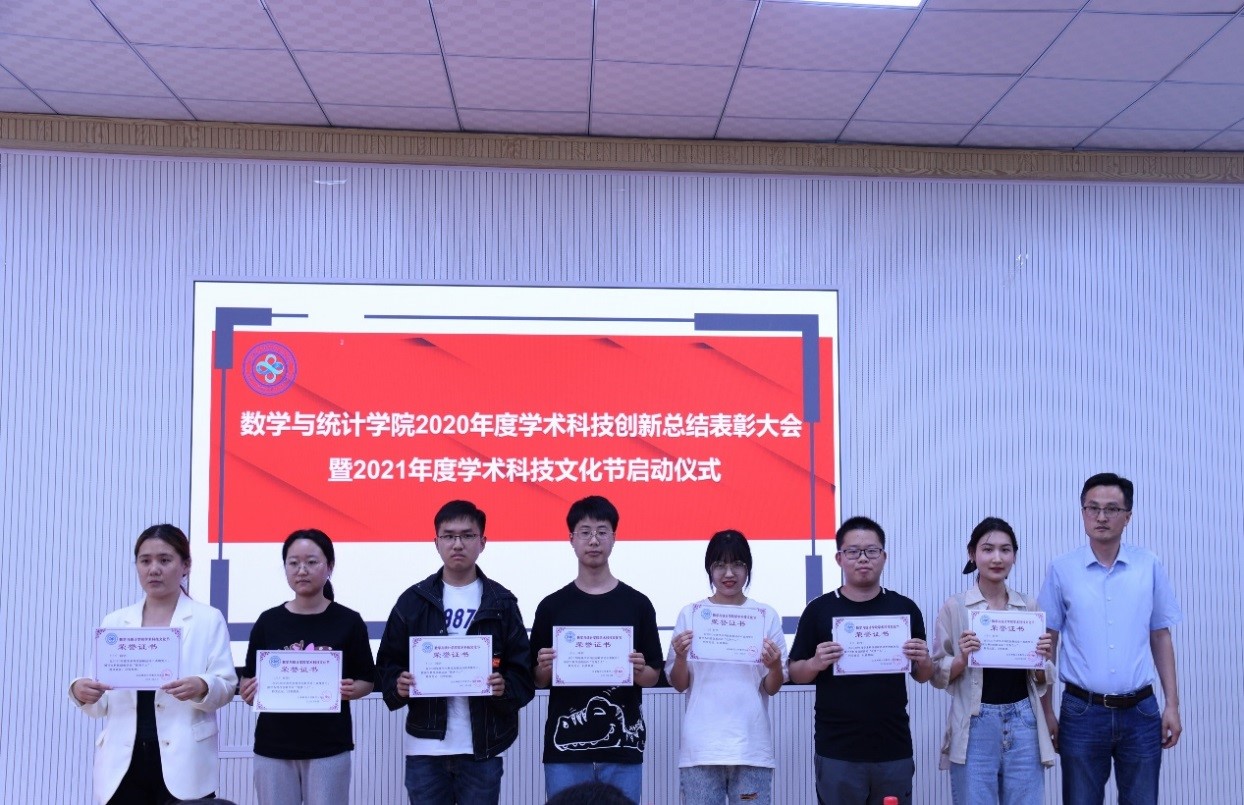 大会伊始,赵强、周兆杰分别宣读了《2020年度学生学术科技创新活动获省级以上奖项统计》和《关于表彰2020年度学生科技创新活动优秀个人和先进个人的决定》,并为获奖同学颁奖。刘冬梅宣读《关于表彰数学院2020年度学生科技创新活动优秀指导教师的决定》,战秉聚和李晓迪分别为优秀指导教师颁奖。