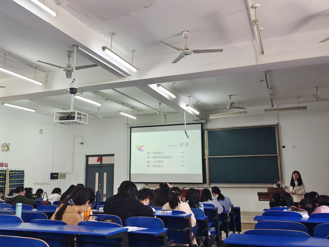 随后,深圳市龙华区教育局及济南黄河双语实验学校分别通过播放宣传片、PPT展示、面对面交流等方式向同学们介绍公司学校的概况、构成、未来发展方向、人员需求以及选择该单位的理由等,同学们也分别向宣讲人提出了一些与将来工作相关的实际问题,并得到了满意的回答。