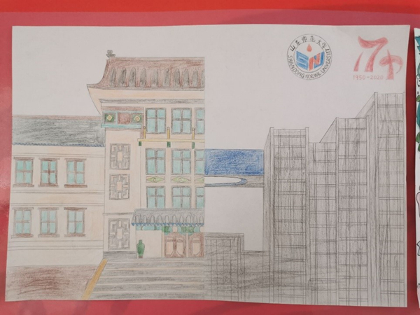 在绘画组作品中,《沉静与灵动》通过彩绘将千佛山校区的文化楼与长清湖校区的天地书声图书馆相结合,描绘出山师建筑古典与现代相结合的特点,含义丰富而深刻。