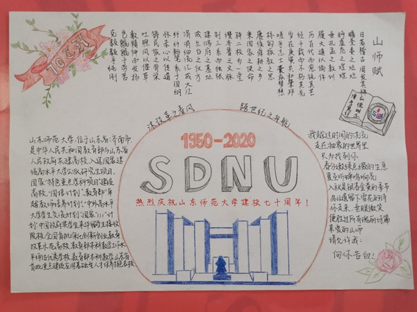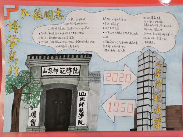 数学类2002班的参赛作品视角独特,运用山师大骨面、石锅拌饭等经典山师美食元素构图,生动形象地表现出“食在山师”的绘画主题。手抄报作品形式多样,各具特色。其中题为《弦歌七十载》的作品将1950年山东师范学院大门与2020年山东师范大学大门做对比,配以山师七十年发展历史,突出山师七十年的蓬勃发展。