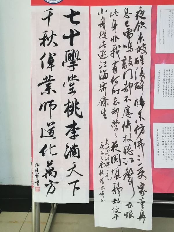 数学本1902班陶佳宁的软笔书法作品以“七十学堂桃李满天下,千秋伟业师道化万方”为题,笔势刚劲有力,行云流水。
