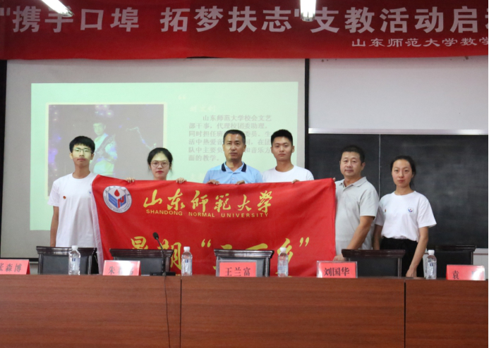 为贯彻落实习近平新时代中国特色社会主义思想,引领广大青年学生切实感受新中国取得的重大成就,7月8日上午,山东师范大学数学与统计学院“携手口埠 拓梦扶志”支教团队于青州市口埠学校报告厅举办支教活动启动仪式。应邀出席本次仪式的有青州市口埠学校王兰富校长、刘国华老师,口埠学校40余名学生参加了此次仪式。