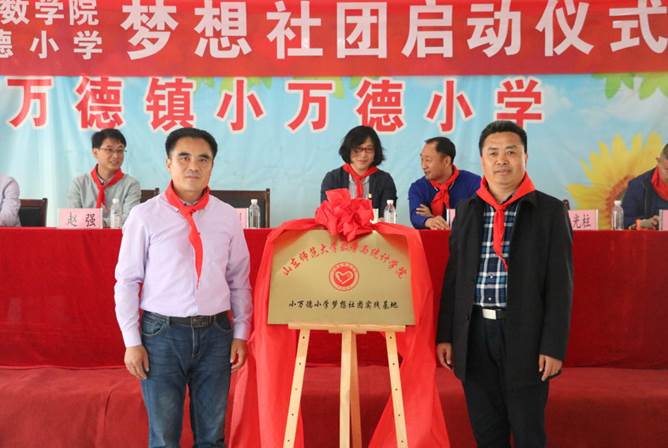 仪式伊始,数学与统计学院副院长赵强首先表达了对于本次活动的祝贺,并介绍了学院的发展历史以及对于人才的培养体系与格局,希望此次的梦想社团志愿活动取得圆满成功。万德街道办事处副主任高臻在致辞中表达了对数学院的感谢和对来宾的欢迎。她讲到万德教育的特点是把社团建设作为教书育人的一大途径,阐述了搭建社团对于学生发展的重大意义,期望小万德小学今后能够取得更好的发展。随后,小万德小学校长王光柱也对学生提出要求,他鼓励学生积极配合,踊跃参与。学院学生志愿者代表李亚园结束发言后,小学生们带来《杯子操》《手指操》等表演,获得了在场师生的阵阵掌声。最后,数学与统计学院党委书记刘庆刚和小万德小学校长王光柱共同进行揭牌仪式。