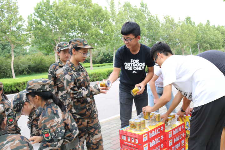 刘衍胜院长与葛海滨书记在烈日下来到训练场地,为新生们送上功能饮料,表达对同学们的关爱之情。然后,刘衍胜院长与教官一一握手,对每一位教官表示感谢。接着,他对2018级新生表示热烈欢迎,对同学们在军训中的表现给给予肯定和鼓励。他说道,军训虽苦,但能磨练人的意志,锻炼人的体魄,我们学院的学生必须要有顽强不屈的精神和健康良好的体魄。只有拥有了顽强不屈的精神,才能攻克一个又一个难题;只有拥有了健康良好的体魄,才能为学院创造一个又一个成就。希望同学们能够永远地记住自己的军训经历,为以后的生活打下良好的基础。随后,刘院长提醒同学们一定要多注意身体,军训期间多补充水分,有什么紧急情况一定要向教官汇报。刘院长关切的话语让新生们感动不已,现场发出一阵热烈的掌声。一瓶瓶功能饮料送到了新生们的手中,不仅让他们缓解了困乏、消除了炎热,更让他们感受到学院的关怀和家的温暖。
