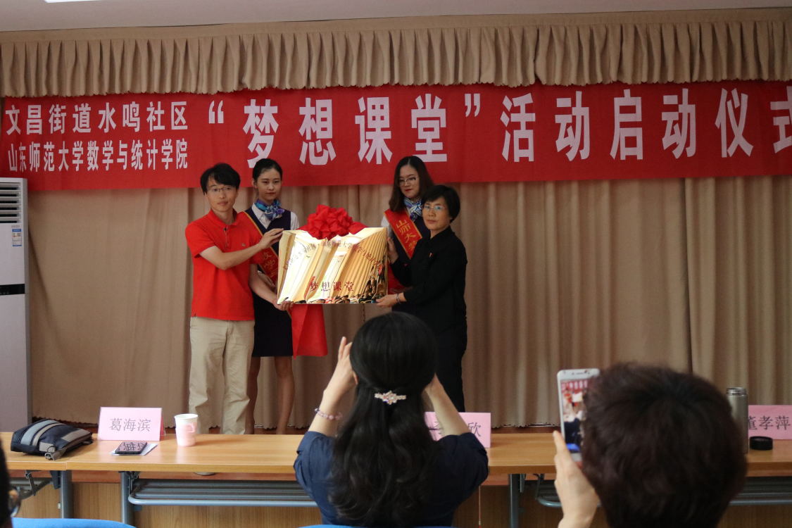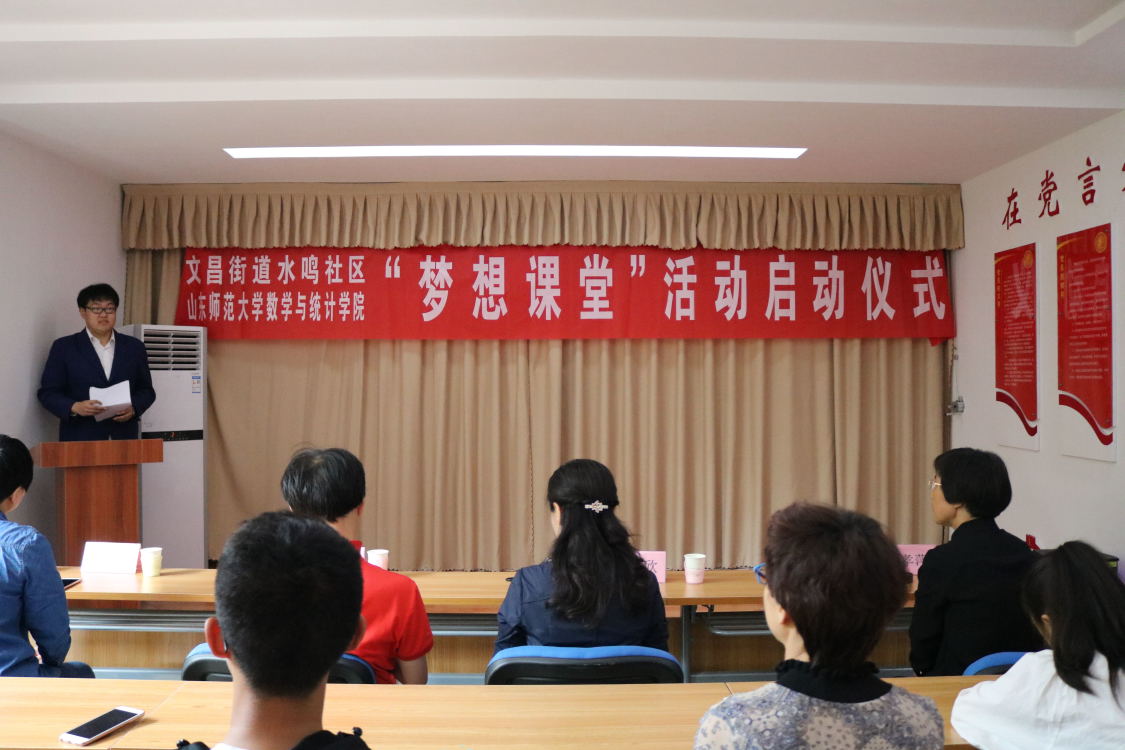 为了充分发挥大学生的主观能动性,把大学生专业优势同社会需求紧密结合起来,更好的为社会服务。6月10日,秉持着“奉献、友爱、互助、进步”的志愿服务精神,数学与统计学院于文昌街道水鸣社区展开了“梦想课堂”活动启动仪式。本次启动仪式由山东师范大学数学院青志协联合文昌社区主办,文昌街道党工委副书记李欣,文昌街道党工委副主任董孝萍,文昌街道团委书记王莹,山东师范大学数学与统计学院团委书记、学工办主任葛海滨出席并参与了本次活动。