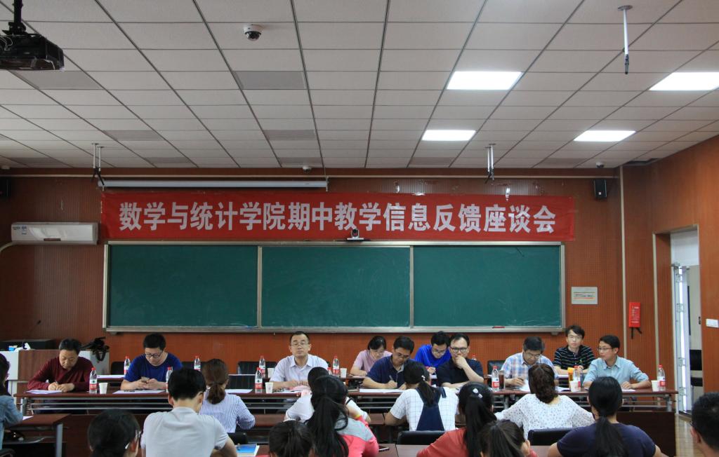 为优化学院的课程设置,总结教学过程中存在问题,助力今后教学活动的开展,5月17日,数学与统计学院于长清湖校区综合教学楼B区434教室举办期中教学信息反馈座谈会。学院全体领导班子、各系(部、中心)主任及教师代表出席与会,副院长赵强主持会议,各年级学习委员及部分学生代表参会。