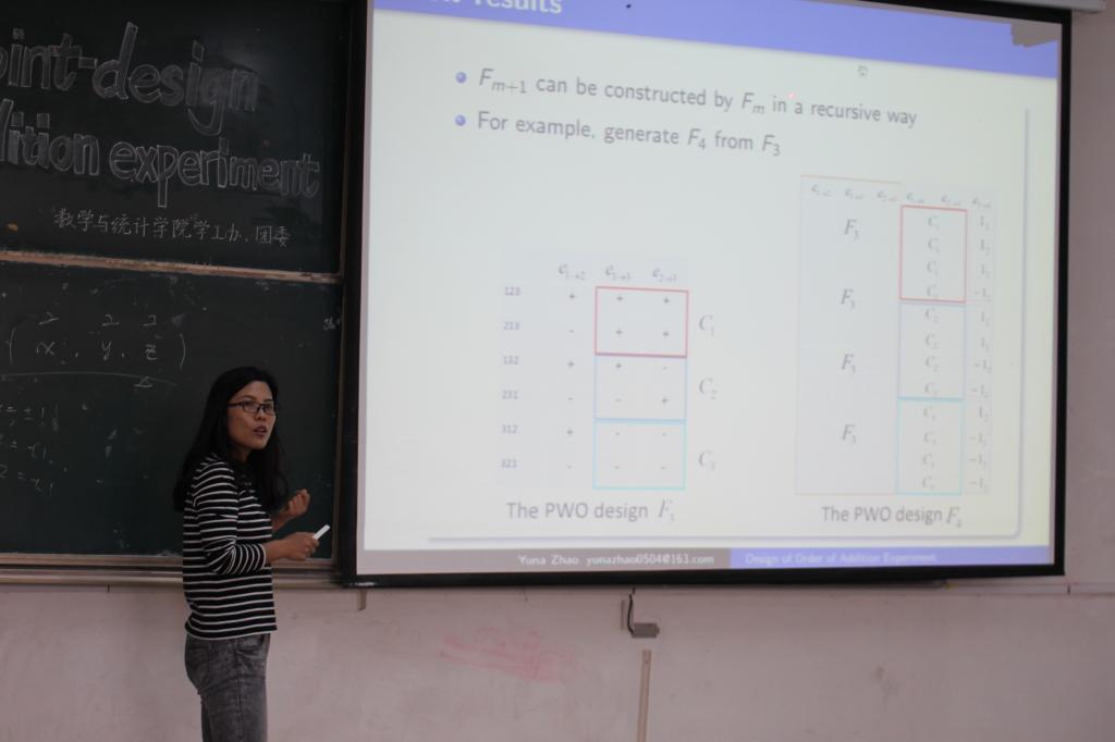 为进一步丰富同学们在加法实验方面的知识,3月23日,数学与统计学院于长清湖校区综合教学楼C区121教室举办“Minimal-point-design for order of addition experiment”报告会。本次报告会由赵玉娜担任主讲人,面向大三大四100余名学子展开。