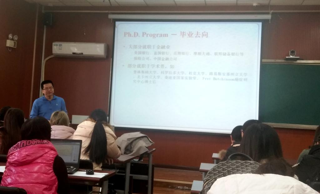 邓绍忠从学校概况和数学统计系概况两方面切入,针对学生关心的具体问题进行了详细介绍。宣讲伊始,邓绍忠介绍了学校的地理位置,他指出夏洛特作为美国南方金融中心近几年发展迅速,并且拥有良好的就业前景。接着,他引入了北卡罗来纳大学夏洛特分校关于教育教学方面的详细信息。他表示,北卡罗来纳大学夏洛特分校分设九个学院,是一所公立综合性研究型大学,优势学科主要包括:MBA、教育、计算机、数学等。随后,邓绍忠让同学们了解了该校的Ph.D.Program和Masters Program,他就学生概况、毕业去向、招生等方面进行了具体解读,并介绍了其校数学与统计系的几位在数学物理、概率论等方面卓有成就的教师。宣讲进行到最后,软科所所长闫宝强就留学生的安全问题以及毕业之后的就业问题与邓绍忠教授进行了交流。至此,本次宣讲会圆满结束。