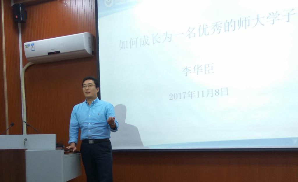 本次党课在2016级辅导员刘菊的主持下缓缓拉开帷幕。首先,李华臣以自己的学习、工作经历引出本次党课的主题——“如何成长为一名优秀的师大学子”。接着,他针对这一关键问题,从学会学习、学会锻炼、学会做人、学会协调四个方面,结合自己的实践体会和感悟与党基班学员进行了分享和交流。李华臣将中国义务教育与高等教育模式和美国义务教育与高等教育模式进行比较,提出大学生更应当在高等教育阶段坚持不断学习;不但要向书本学习,还要向实践学习;不但要学习专业知识,还要学习课外知识。除此之外,大学生还应当坚持一种适合自己的体育运动,锻炼身体,磨练意志。在学会做人方面,李华臣引用曾国藩信仰的“修身齐家治国平天下”的思想理念和机关单位中“德才兼备,以德为先”的用人标准,指出为适应社会的发展,当代大学生应当培养坚毅的性格,良好的品格、健全的人格。随后,他表示在学会学习、学会锻炼、学会做人的基础上,为成为一名优秀的师大学子,同学们还应该学会协调学习和其他事务之间的关系,结合实践经历培养自己处理事情的能力。李华臣用幽默的话语、鲜活的事例为党基班学员教授了一场精彩的党课,学员们获益匪浅。最后,李华臣希望党基班学员能不忘初心,砥砺前行,顺利通过党基班结业考试。至此,本次主题党课圆满结束。