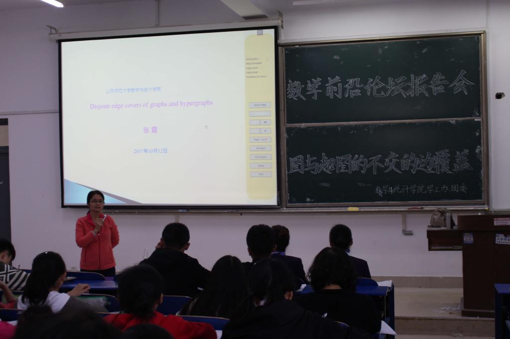为增加同学们对图论的了解,10月12日,数学与统计学院于长清湖校区综合教学楼B区301教室举办了“图与超图的不交的边覆盖”专题报告会,此次报告会由数学院学工办、团委举办,由张霞担任主讲人,数学院200余名同学到场聆听。