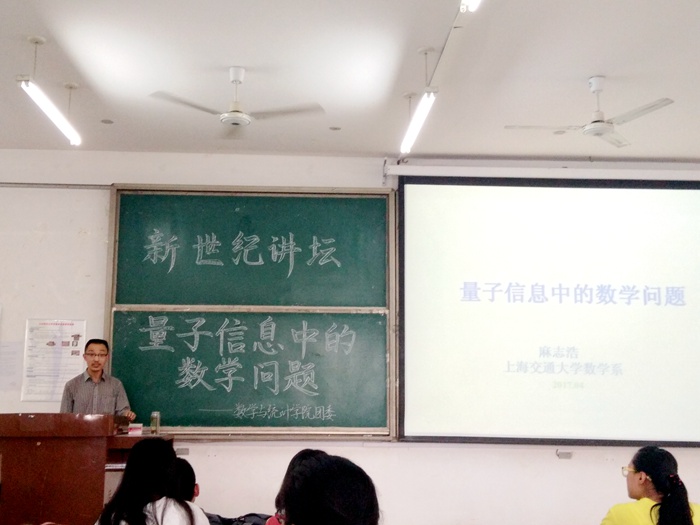 为帮助大家了解量子信息与数学的关系,拓展同学们的科学视野,5月18日下午,数学与统计学院于长清湖校区综合教学楼C区319教室举办“量子信息中的数学问题”报告会,本次报告会邀请到上海交通大学数学系麻志浩教授担任主讲人,数学系主任张德瑜、教师刘红星出席了此次报告会,数学院200余名同学到场聆听。