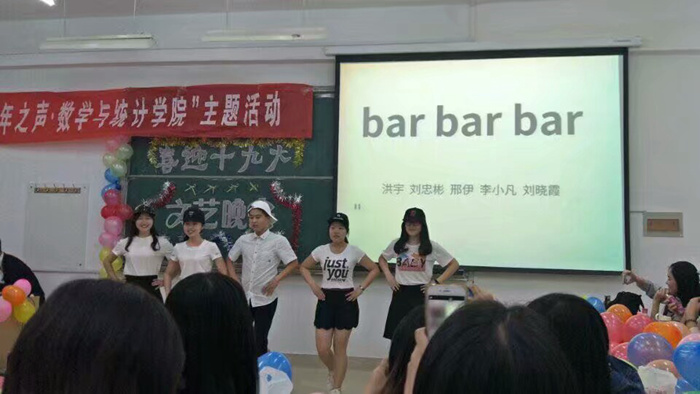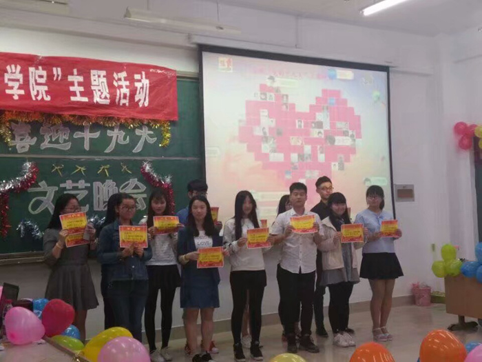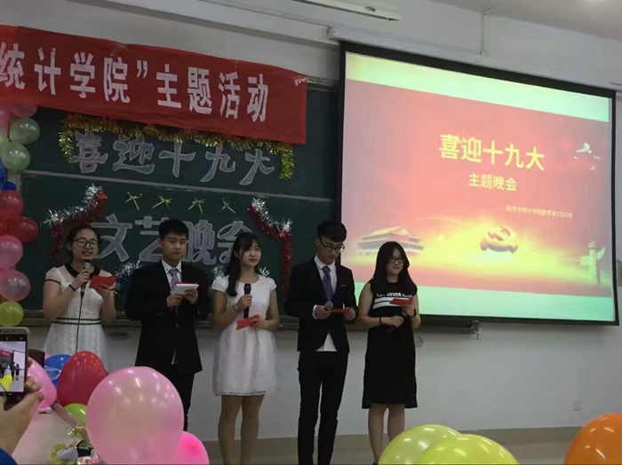 活动通知一经下达,便得到各班积极响应。此次活动主要通过微博网络直播方式,以举办主题班会或红色主题晚会的形式,宣传党的光辉历程,激励同学们不忘初心,砥砺前行,做新世纪有理想、有信仰的新青年,迎接党的十九大的召开。此次活动方式多样,形式新颖。其中,红色知识竞答环节带领同学们温习了中国共产党的发展历史,建党以来的光荣事迹,给同学们上了一堂别开生面的党课;“唱红歌、念党情”环节,通过演唱《歌唱祖国》、《国家》、《山丹丹花开红艳艳》等经典红歌,同学们感受到了党对人民群众的深切关怀,国家自豪感和民族荣誉感油然而生;“井冈山头的号角,万里长征的战歌......”,诗歌朗诵环节,伴随慷慨讲的音乐,同学们饱含对党和国家的深切热爱,将一首《党啊,我的母亲》深情诵出。其中15级数学一班微信上墙环节得到同学们的一致好评,同学们在活动过程中对节目实时评论,增加了同学们的参加度,使晚会充满趣味快乐。15级数金、16级数师本的武术表演“少年强则中国强”动作刚柔并济,充满中国风,将活动气氛引向高潮。16级数学一班,15级数学四班的小品和话剧表演同样能体会到同学们将对党的热爱。最后,伴着各班慷慨激昂的大合唱,晚会圆满结束。