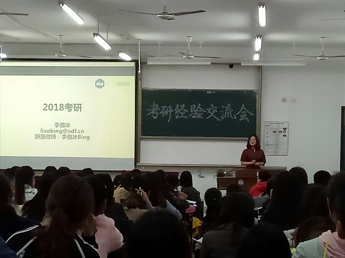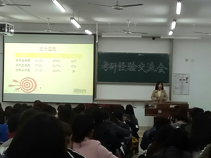 本次交流会以影片《无忧考研记》拉开帷幕,主持人通过影片向大家简要介绍了本次交流会的两位主讲人,现场同学以热烈的掌声欢迎高杨、李傲冰的到来。首先,由高杨向大家分享关于考研政治的有关内容。高杨从内因和外因两大方面剖析考研政治如何得高分。内因,顾名思义是指大家应该如何复习、复习什么。高杨条理清晰地向大家分析了考研政治的三大题型、五大科目,其中,她指出多项选择题的重要性,并给出了“多选决定成败”的观点。其次,高杨讲解了周年事件、时事热点、重要会议等命题重点,使同学们对于考研政治的相关内容有了更深一步的理解。外因,即阅卷过程中的因素,高杨就卷面整洁、分点作答、按分答题、不留空白等注意事项,讲解了阅卷场的“潜规则”。在场同学聚精会神,认真聆听。同时,高杨提醒同学们要根据各类院校的分数线确定自己的目标分数线。经过高杨耐心细致的讲解,在场同学纷纷表示受益匪浅。紧接着,由李傲冰为大家讲解考研英语的有关技巧。她开门见山,直奔主题,以自身减肥经历为例生动形象地告诉同学们要明确考研目标。她告诉同学们要有适合自己的英语复习计划,并以诙谐幽默的语言,给出了英语复习“三部曲”——基础阶段、强化阶段和冲刺阶段。最后,李傲冰向大家分享了词汇记忆的筛选法、长难句语法的拆分法。讲解过程中,她不时引用风趣的语句,穿插历年考研真题的讲解,在缓解同学们压力的同时,使同学们学习了做题技巧,赢得大家的阵阵掌声与欢呼。至此,本次交流会圆满结束。
