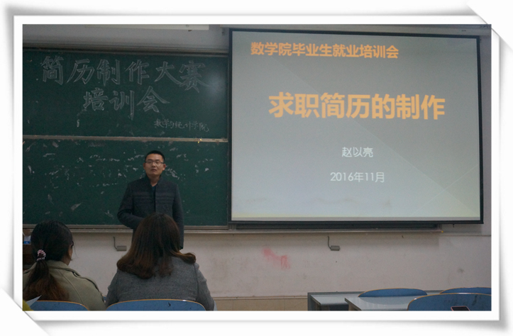 为提高同学们简历制作的能力,增强就业求职的意识,11月20日,数学与统计学院于长清湖校区综合教学楼C区127教室举办简历制作大赛培训会。此次培训会由数科院13级辅导员赵以亮担任主讲,面向数科院全体同学展开。