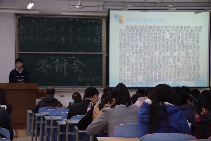 下午两点,答辩会正式开始,各个项目组负责人依次上台答辩。项目负责人结合精心准备的PPT,逐次介绍了项目研究的目的和意义、研究步骤和方法以及主要成果。同学们着重介绍了项目的创新点和特色。其中,李浩东团队的“WarmU”校园慈善商店创业项目,基于高校内同学们的二手商品,利用线上、线下两个平台,通过建立微信公众号、开设淘宝网店等途径,实施了具体有效的运作模式,并将盈利所得用于慈善,项目的立意及创新特色得到了在座专家老师和同学们的一致好评。王青华团队介绍了“游戏公园排队等候问题建模与数值模拟”,她首先对项目进度安排进行了介绍,通过文献研究、实地研究、建模研究等多种研究方法,建立了多个模型并选择优化,得出最优模型。期间,专家老师就该项目模型与银行系统排队模型的区别以及实际应用等问题与项目负责人进行了深入交流,面对专家提出的问题,她胸有成竹,沉着冷静,深刻而独到的回答得到了专家的一致认可。邱玉霞带领的团队则研究了“流体力学及数值模拟”,她着重介绍了交通流理论,并且分析了关于质量守恒方程的三维连续性微分方程的推导以及流函数的模拟,旨在解决实际交通问题,专家老师就“非线性扩散项”对邱玉霞进行了提问,她结合该问题的数学意义,科学合理、言简意赅的回答了该问题。答辩结束后,姜子文教授总结了同学们的研究成果,他指出同学们解决问题的思路清晰且新颖,具有很强的创新性,同时他也指出了在模型完善与推广方面仍需加强,他鼓励同学们在日后的学习生活中加强创新思维的锻炼,不断提高综合素质。