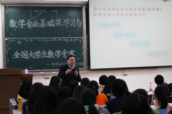 为帮助同学们更好地进行数学专业课的学习,积极引导同学们更有效地准备全国大学生数学竞赛,10月27日,数学与统计学院在长清湖校区综合教学楼C区119教室举办“数学专业基础课学习与全国大学生数学竞赛”主题讲座,山东大学张天德教授受邀担任主讲人,学院部分教师及2015级200余名同学到场聆听了此次报告会。报告会由数学院院长刘衍胜教授主持。