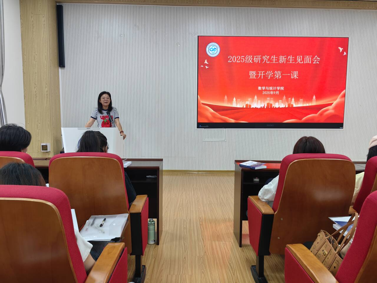 随后,王景补充网络意识形态纪律要求,提醒全体同学“擦亮眼睛、稳住情绪、管好键盘”,在面对社会热点事件时保持理性,发挥数学人的严谨精神,做到“不造谣、不信谣、不传谣”,主动传播正能量。谈及研究生生涯规划,王景鼓励同学们珍惜“最后一程学生时光”,专注自身素质与能力提升,积极参与品牌赛事和学院组织的各项活动。她最后寄语:“愿你们与学院同呼吸、与学校共荣辱,度过充实美满的研究生生活。”