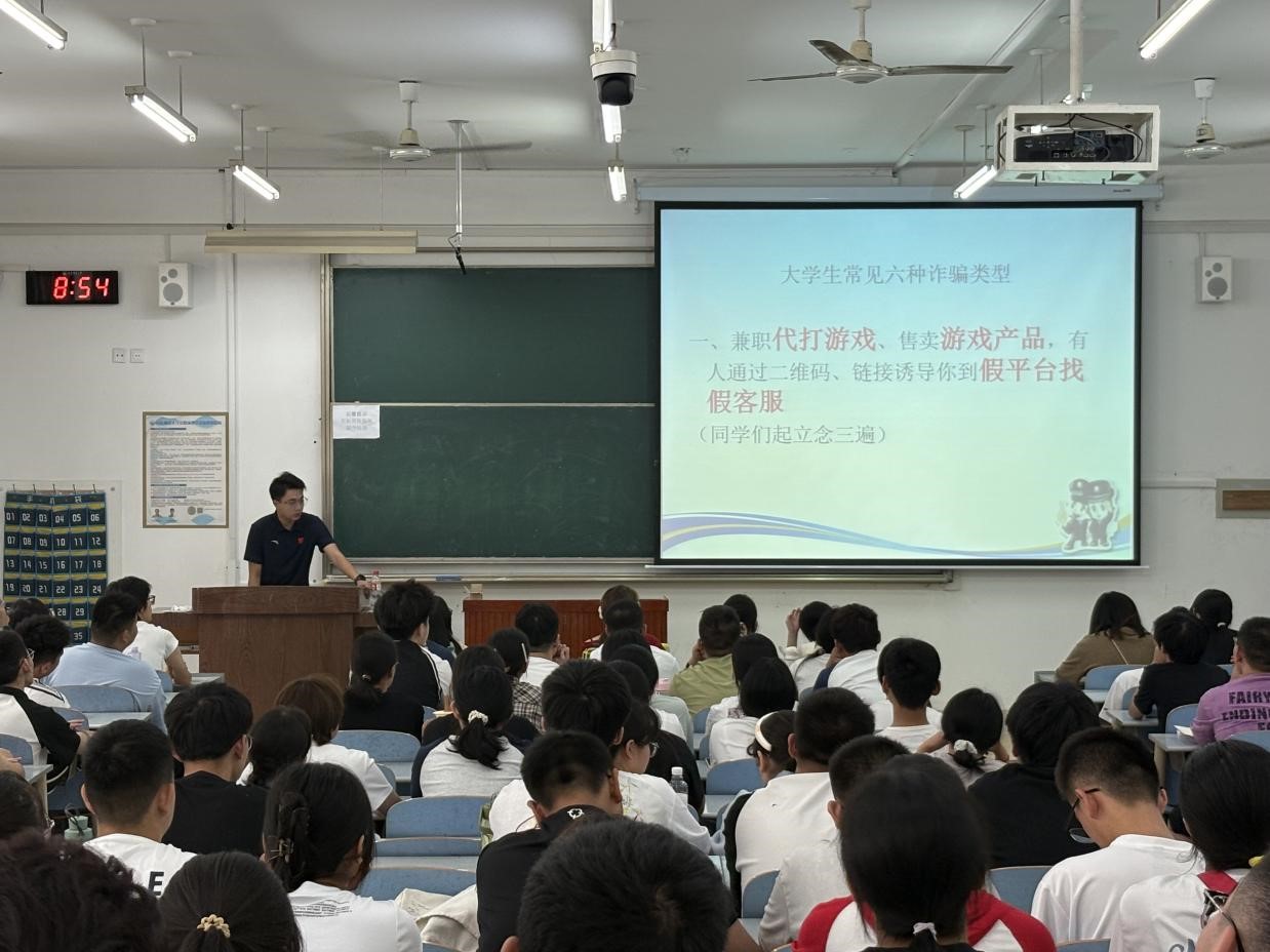 防诈骗主题班会同步开展。刘睿通过案例分析、视频展示等方式,向新生普及了常见的诈骗手段和防范方法,提高了新生的安全防范意识和自我保护能力。新生们认真聆听,不时交流讨论,纷纷表示将提高警惕,谨防诈骗。