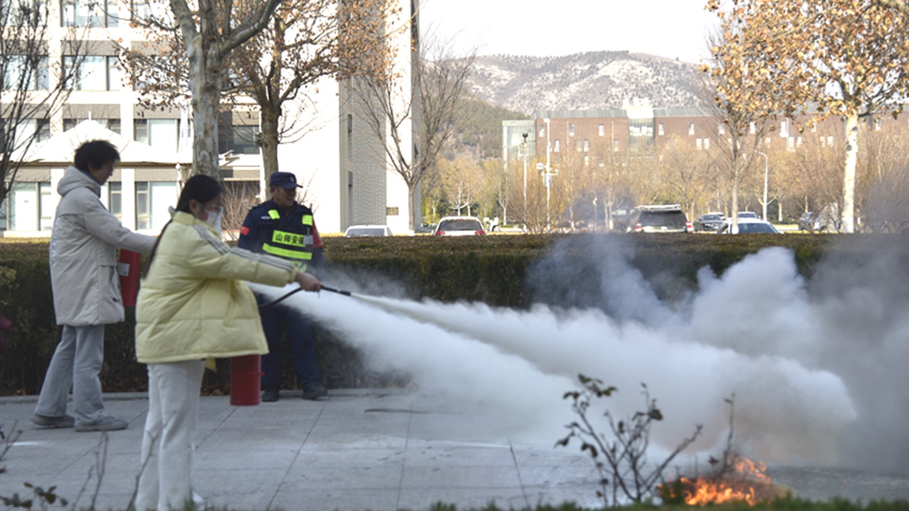 理论讲解结束后,实战演练环节有序推进。在工作人员的专业引导下,参与师生按照疏散规范,从教室快速有序撤离至楼外指定安全区域。整个疏散过程紧张有序、衔接顺畅,全体人员均在规定时间内完成集合与人数清点,充分展现了良好的应急反应能力。随后,师生们移步至文渊楼B区北侧实操场地,开展灭火器实战练习。工作人员先细致演示“提、拔、握、压”核心操作要领,再分组进行手把手指导。参与师生轮番上阵,亲手操作扑灭模拟火源,在沉浸式实战场景中切实掌握了初起火灾的科学扑救方法。