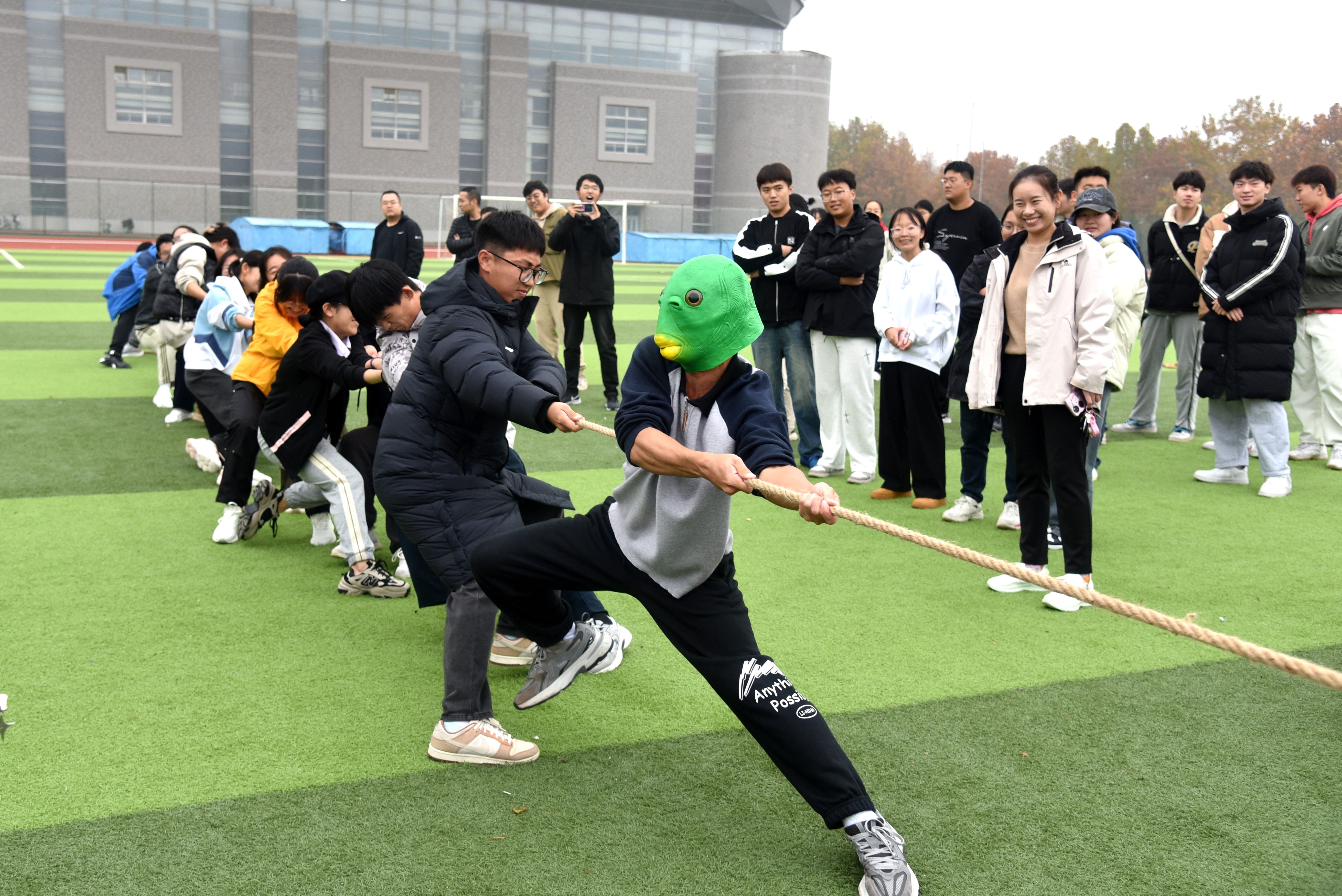 在比赛过程中,有的班级凭借着出色的团队配合和强大的爆发力,一开始便占据了优势;而有的班级虽暂处劣势,但他们毫不气馁,咬紧牙关,坚持到最后一刻;也有的班级,队首同学戴上“绿头鱼”,巧出妙招。