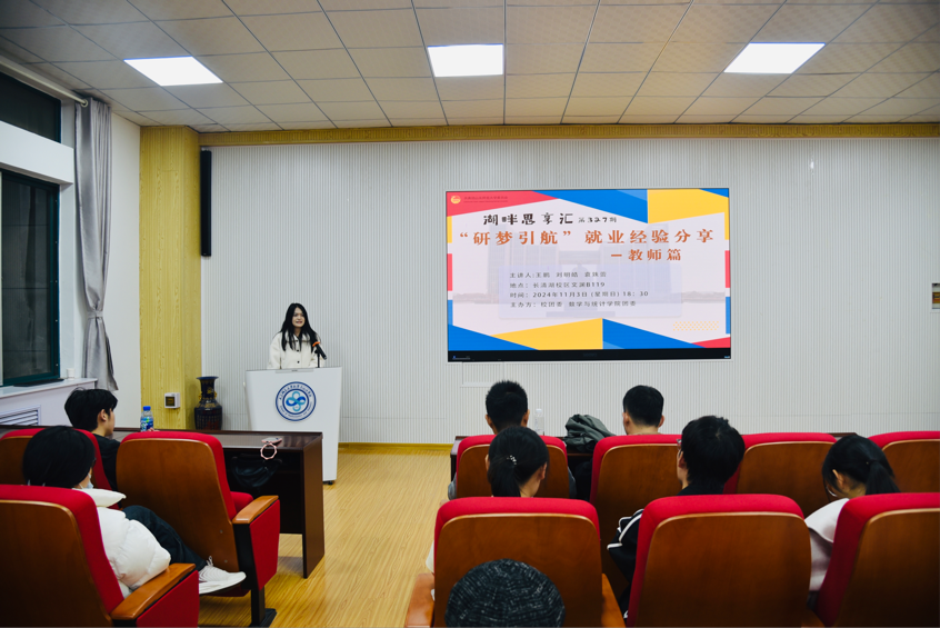 11月3日,数学与统计学院在文渊楼B119报告厅举办湖畔思享会之“研梦引航”就业经验分享教师篇主题讲座。本次活动由校团委、数学与统计学院团委联合举办,我院2024届硕士毕业生王鹏和刘明皓主讲,学院近百名学生积极与会。