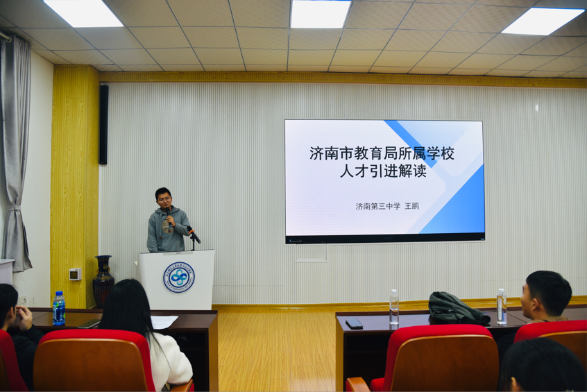 王鹏主要对济南市教育局所属学校人才引进政策进行了详细解读,从信息搜集、岗位要求、备考应考三个方面向大家分享了经验。在就业择业方面,他建议同学们有效利用线上和线下各类信息,提前了解各地招聘政策要求并制定相应备考计划。