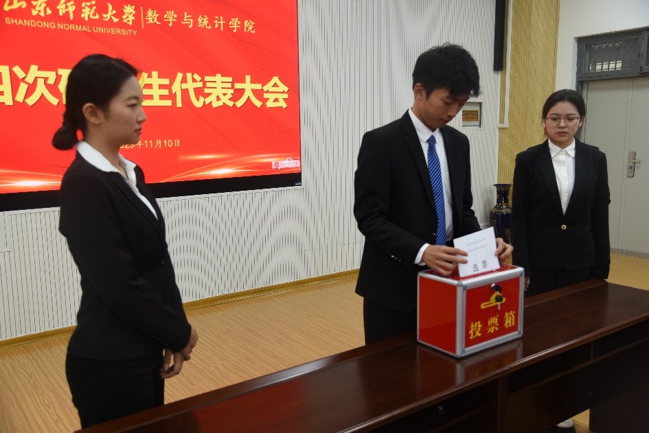 正式会议上,刘晓玲同学做题为《磨砺锻炼品质 奋斗成就梦想 凝聚团结青年学子为加快建设国际知名的一流师范大学团结奋斗》的工作报告,随后,大会通过了《大会选举办法》、《数学与统计学院第四届研究生会委员会候选人名单》、《数学与统计学院第四届研究生会主席团候选人名单》、《山东师范大学数学与统计学院研究生会工作报告的决议》,选举产生了学院第四届研究生会委员会、主席团。