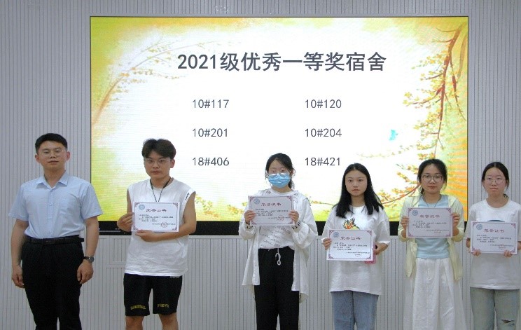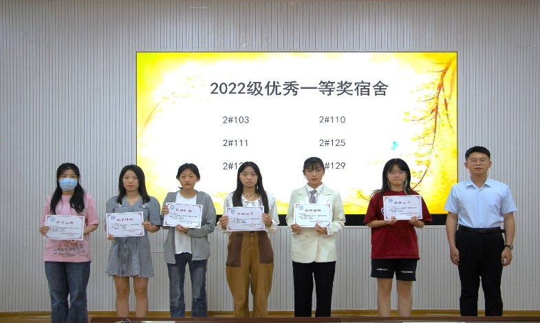 接下来是优秀宿舍表彰环节,获奖的宿舍代表依次上台领奖,张世桢为获奖宿舍颁发奖状并合影,同时也向获奖宿舍表示祝贺。