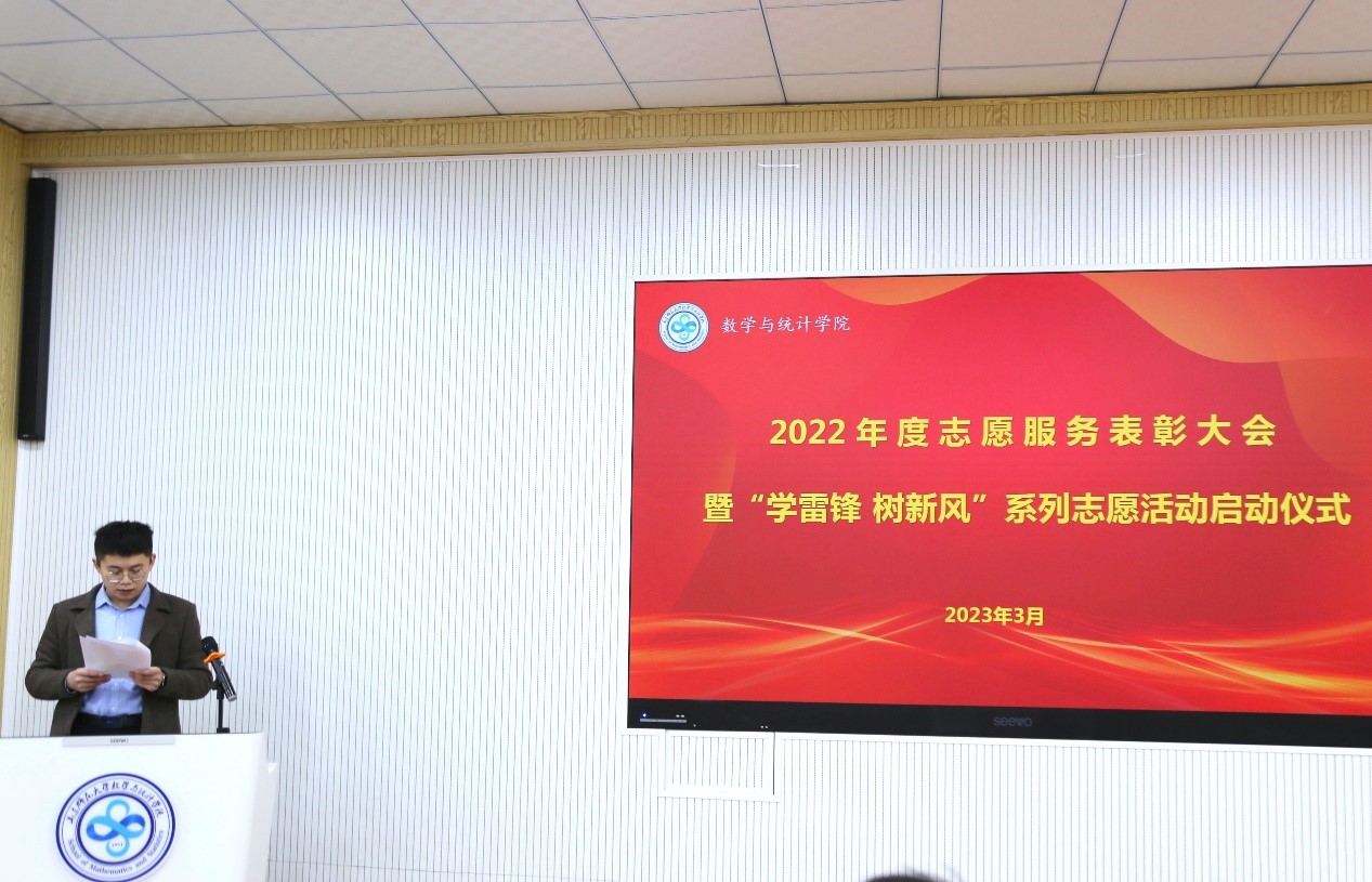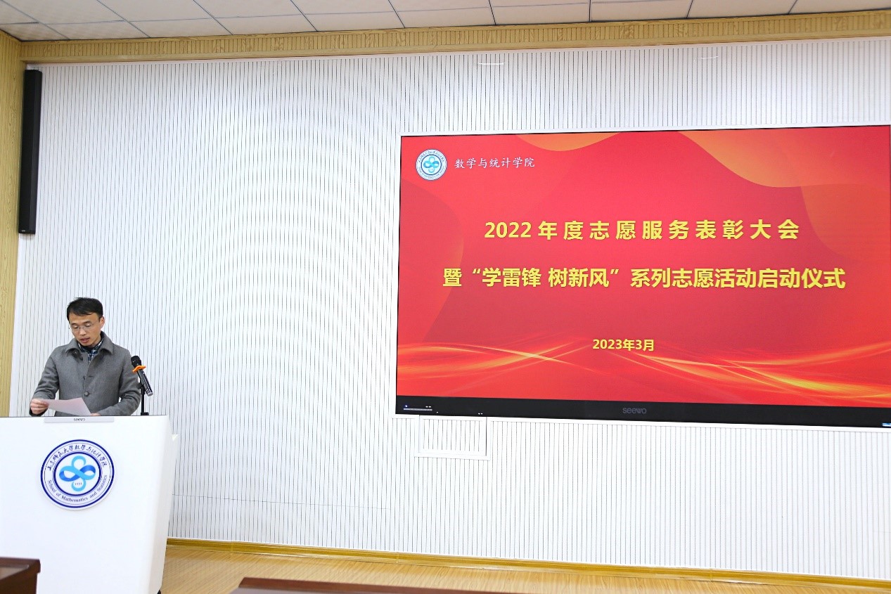 3月3日,数学与统计学院团委于文渊楼B区119会议室隆重举行2022年度志愿服务表彰大会暨“学雷锋 树新风”系列志愿活动启动仪式。学院全体辅导员和学生志愿者代表参加了此次会议。