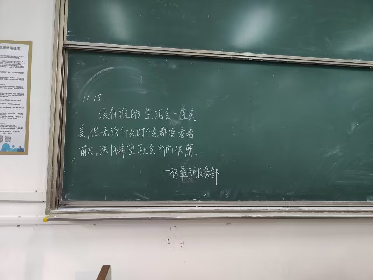 权益与服务部联合心理协会组织举办了以文字的形式向同学们传递正能量的“每日一言”活动。经工作人员选取合适的暖心语句后,由各班心理委员写于晚自习的黑板上或转发至班级群。
