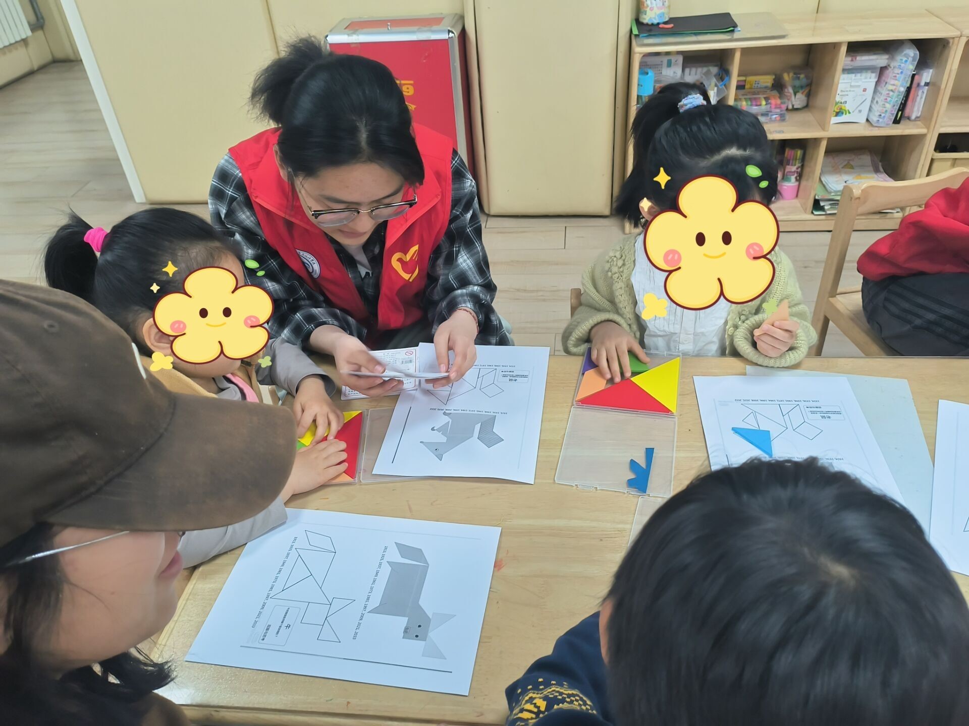 活动中,志愿者带领小朋友们用七巧板拼接生肖图案。志愿者耐心细致地教学,为小朋友们介绍每一块七巧板的名称和独特特点,小朋友们眼中闪烁着好奇与期待的光芒,大家巧妙地运用这些小板块,拼出了栩栩如生的生肖图案,脸上洋溢着开心和满足的笑容。