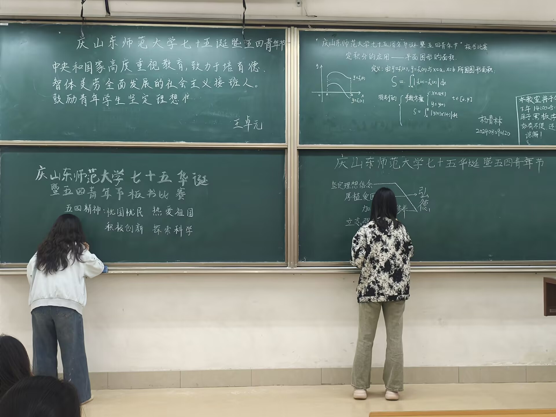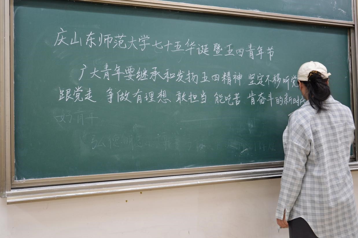 在庆祝山东师范大学建校七十五周年和五四青年节之际,4月24日下午,我院于文渊楼B102教室举办了一场板书比赛。2023级与2024级学生踊跃参与,我院教师代表韩傲、牛珍珍等担任评委。