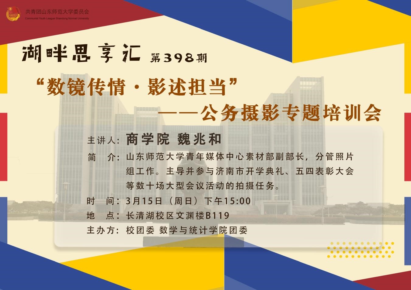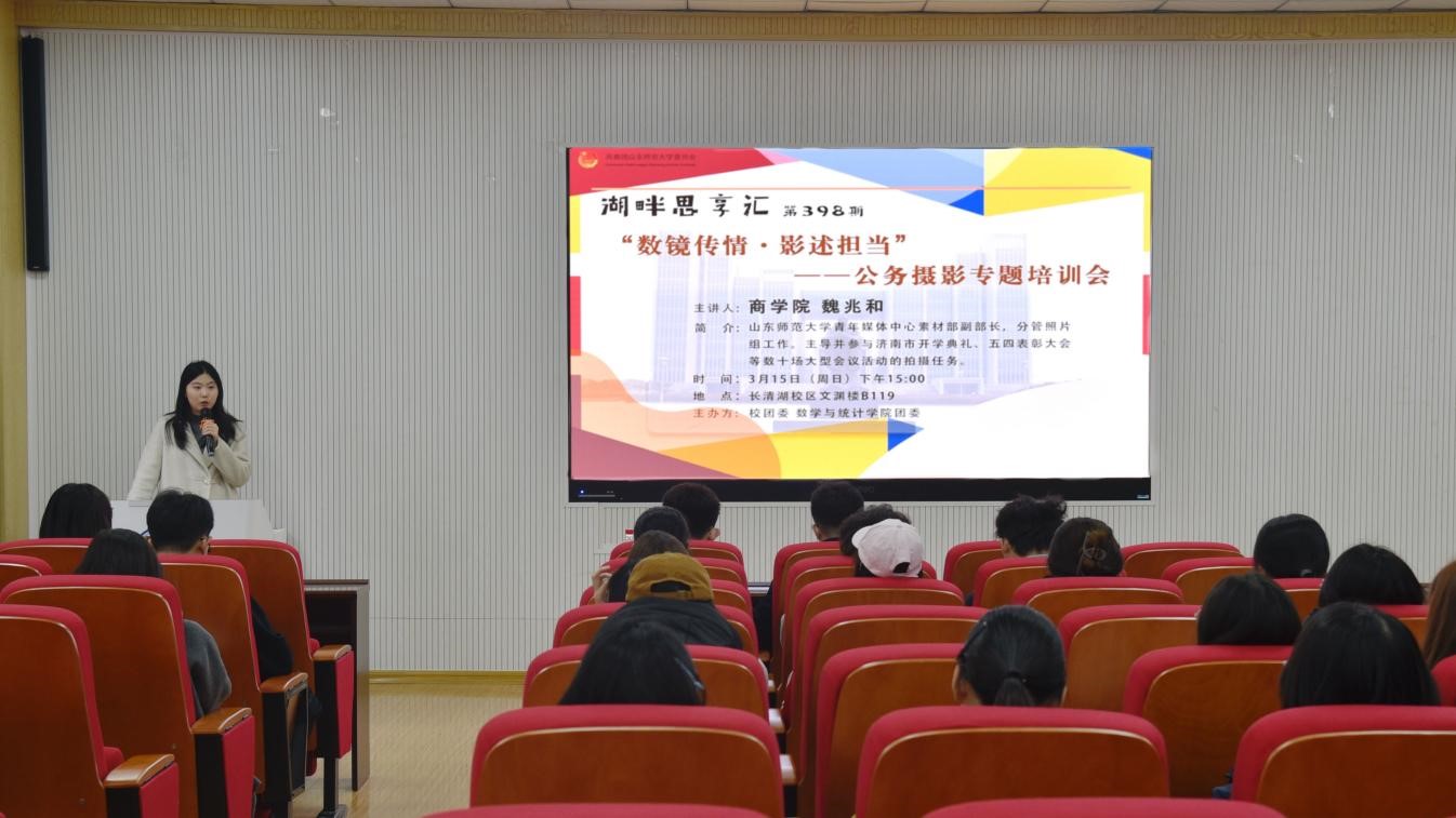 3月15日下午,由校团委和数学与统计学院团委联合主办的第398期湖畔思享汇于长清湖校区文渊楼B119报告厅举办。本次活动以“数镜传情・影述担当”为主题,特邀山东师范大学青年媒体中心素材部副部长魏兆和同学担任主讲嘉宾。