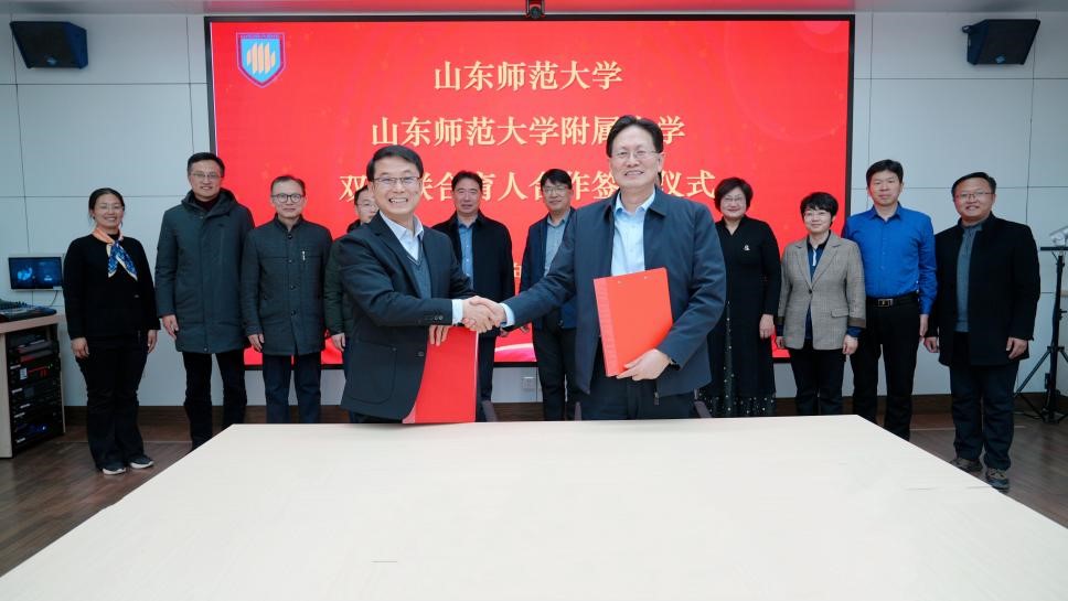 为更好地创新人才培养模式,加强师范院校与中小学校互联互通、资源共享、共同提升,3月6日,数学与统计学院与附属中学成功举行双高联合育人签约仪式。出席此次签约仪式的有山东师范大学附属中学校长苗禾鸣、党委书记杨仁勇等领导老师,我院领导班子成员及相关负责老师参会。签约仪式由附属中学副校长李成金主持。
