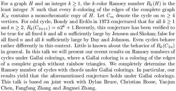 报告人简介:宋梓霞,美国 University of Central Florida数学系教授,博士生导师,主要研究领域为图论。2000-2004年在美国Georgia Institute of Technology获算法组合优化博士学位,2004-2005年在美国The Ohio State University数学系从事博士后研究。2005年授聘于美国University of Central Florida数学系,获得2009-2011美国NSA科研基金和2019-2022美国NSF科研基金,是美国自然科学基金(NSF)的基金评委,获校优秀教师奖和科研奖。在 Journal of Combinatorial Theory, Series B、Combinatorica、SIAM Journal on Discrete Mathematics、Journal of Graph Theory等图论组合领域顶尖杂志发表SCI论文多篇。