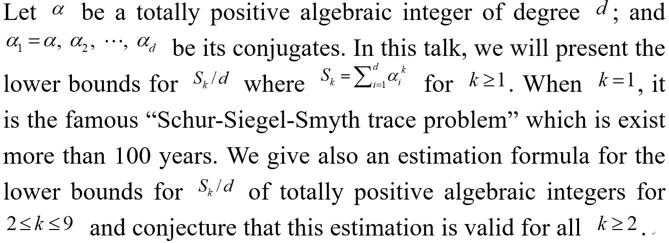报告题目:The sum of the kth-power of conjugates of totally positive algebraic integers
