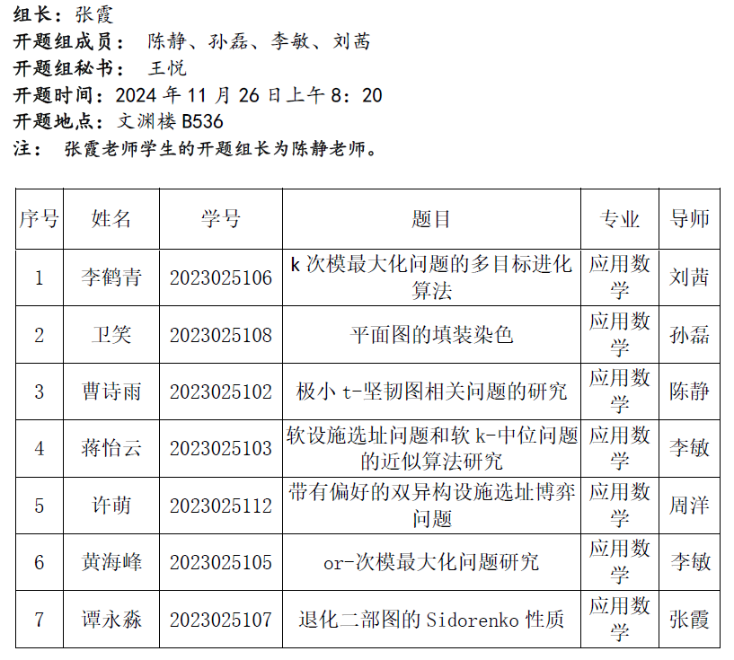 2024.11.26数学与统计学院2023级应用数学专业(图论组合优化方向)研究生学位论文开题公告